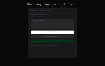 SkillKit 是一个 Chrome 扩展,旨在通过允许用户将任何网页保存为可重用的 AI 代理技能来增强生产力。这个工具对开发者和技术爱好者特别有益,因为它支持 44 种不同的编码代理,如 Claude Code、Codex 和 Gemini CLI。用户只需点击一下,就可以从网页中提取内容,然后将其转换为可立即使用的 SKILL.md 文件。该扩展提供多种保存选项,包括保存整个页面或特定文本选择,确保用户在创建技能时的灵活性。